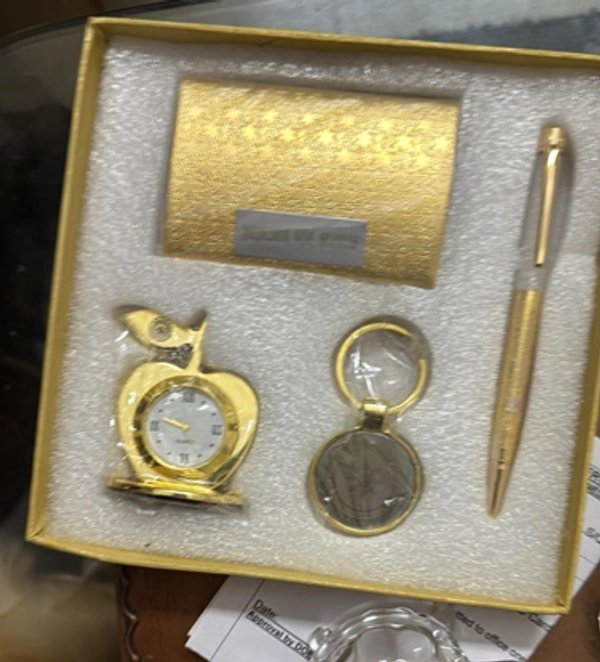 4 IN 1 COMBO GIFT SET (TABLE TOP CLOCK, GOLDEN KEYCHAIN, CLASSIC LOOK GLITTER PEN & BUSINESS CARD HOLDER)