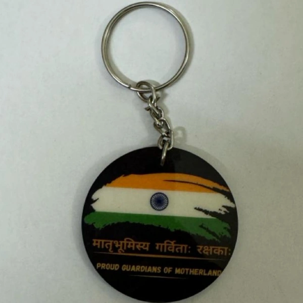 Showcase your pride for the Indian Armed Forces and their unwavering dedication to protecting our nation with this elegant keychain. Featuring the vibrant Indian flag in a bold, artistic style and the powerful message "Proud Guardians of Motherland" in both Sanskrit and English, this keychain is a tribute to the bravery and sacrifice of our soldiers.
