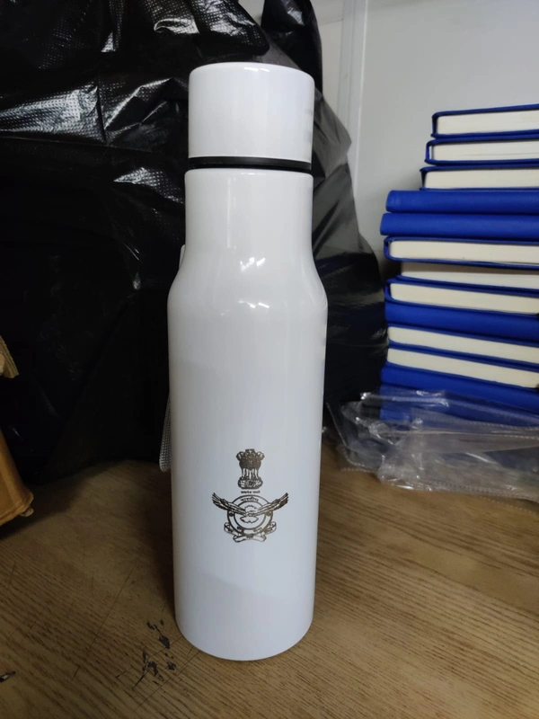 Show your dedication and stay refreshed with this elegant white insulated bottle, proudly displaying the Indian Air Force emblem. This bottle combines a clean, minimalist aesthetic with the functionality of a high-quality insulated container, making it perfect for daily use or special occasions.